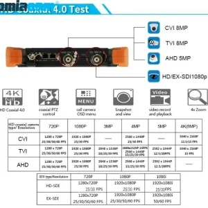 Power output options include DC24V, DC12V, and DC48V PoE, making it easy to power a variety of devices directly through the tester. Its ONVIF protocol support ensures compatibility with popular camera brands like Axis and Hikvision. Additional tools like a video level meter, color bar generator, and real-time recording and playback functions make this a comprehensive camera analysis tool.